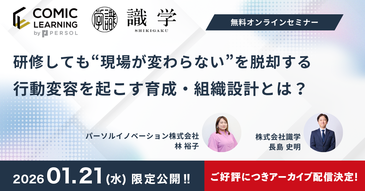 登壇企業として、組織設計・マネジメント理論に強みを持つ 識学 と、学びから行動変容を促す研修デザインに強みを持つ コミックラーニング がタッグを組み、理論×実践の融合視点で進めます。